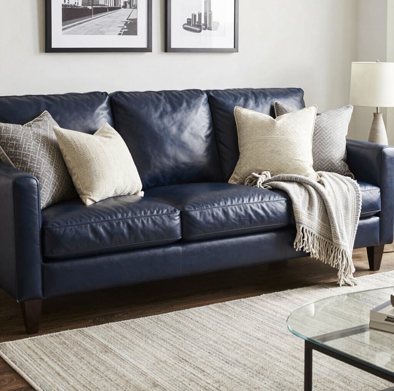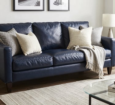 La-Z-Boy furniture needs to have a place in everyone's home for comfort, beauty, value, and style. Navy blue is multi seasonal and looks fabulous in spring and summer with light neutral pillows and maybe a pop of soft green or other shades of blues in pillows. In fall, that same navy leather pairs well with brown and yellow hues. In the winter months, red and navy plaid pillows can accent well with the rich, navy leather. Faux fur pillows can fill in too for the winter months.